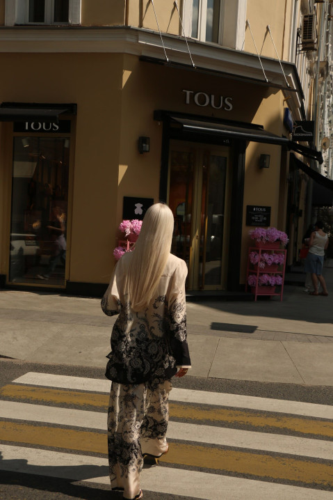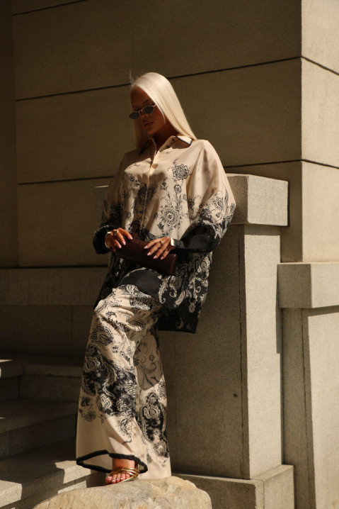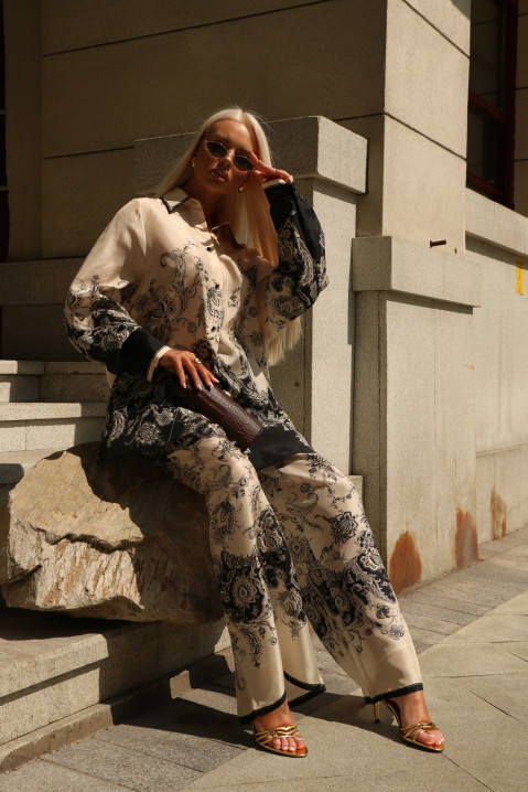 Костюм в пижамном стиле в черно-бежевом принте.
