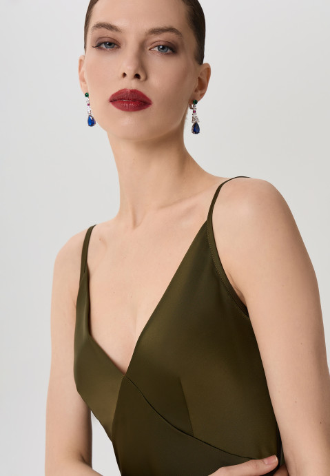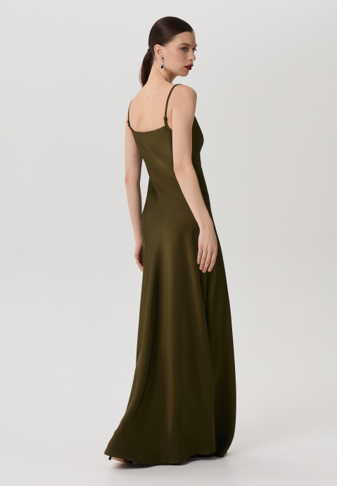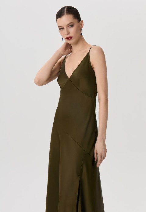 Платье выполнено из легкого и воздушного атласа, который нежно обнимает фигуру, создавая эффект струящегося силуэта. Удобные тонкие бретели, глубокий вырез и разрез по ноге придают образу романтичности и шарма. Минималистичный дизайн позволяет вам легко сочетать его с различными аксессуарами, создавая уникальные образы на каждый день.