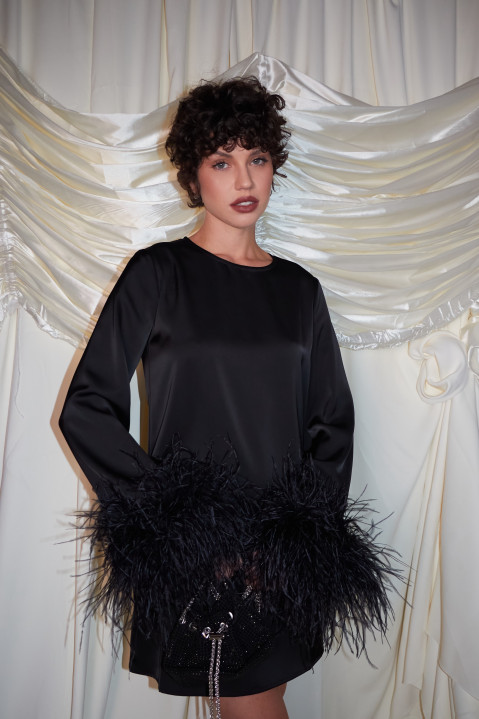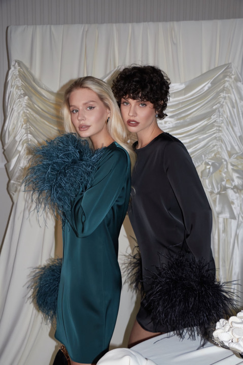 Очаровательное мини-платье полуприлегающего силуэта с длинными рукавами, декорированное натуральными перьями. Идеальный выбор для вечернего выхода или особого события! Подчеркните свою индивидуальность и стиль с этим эффектным нарядом.
