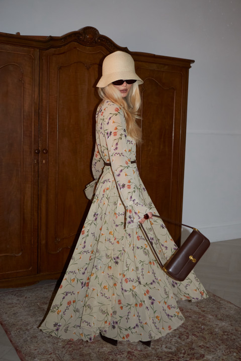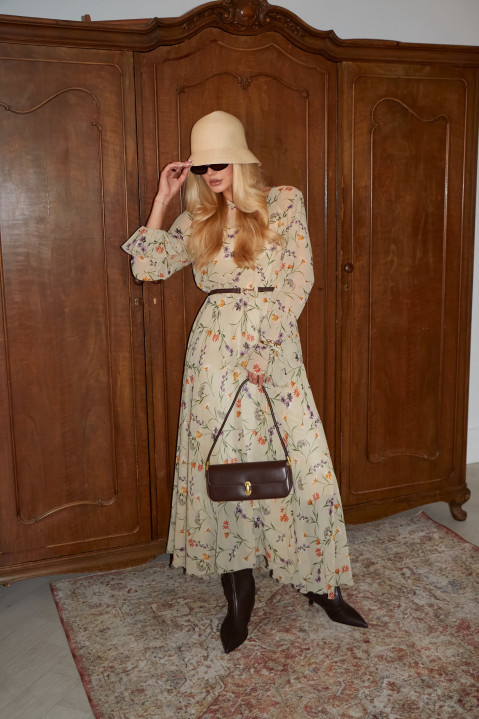 Воздушное платье миди в мелкий цветочный принт идеально передает дух романтики и нежности, создавая впечатление легкости и свободы. Длинные рукава добавляют элегантности и делают его идеальным выбором на каждый день. Плавный силуэт подчеркивает фигуру, а мягкие линии драпировки создают эффект струящейся ткани, позволяя вам чувствовать себя комфортно и уверенно в любой ситуации.