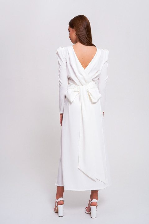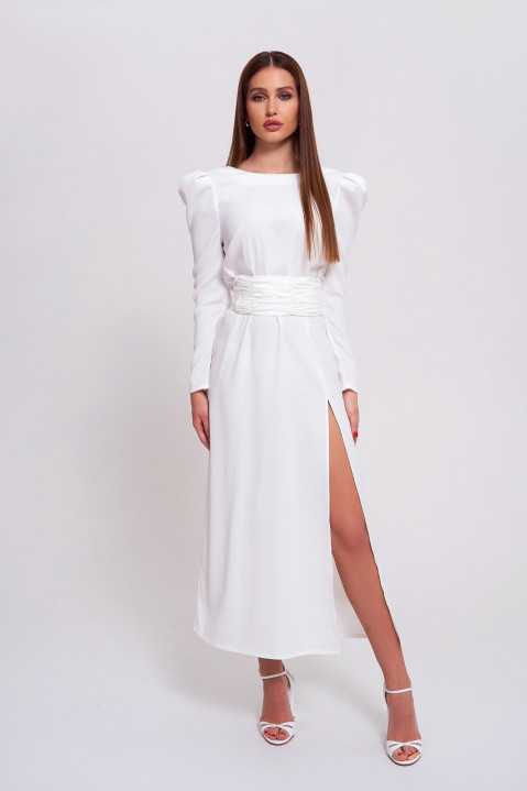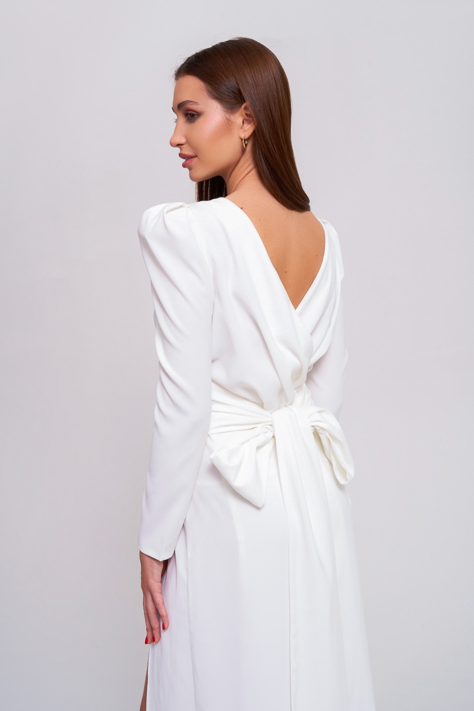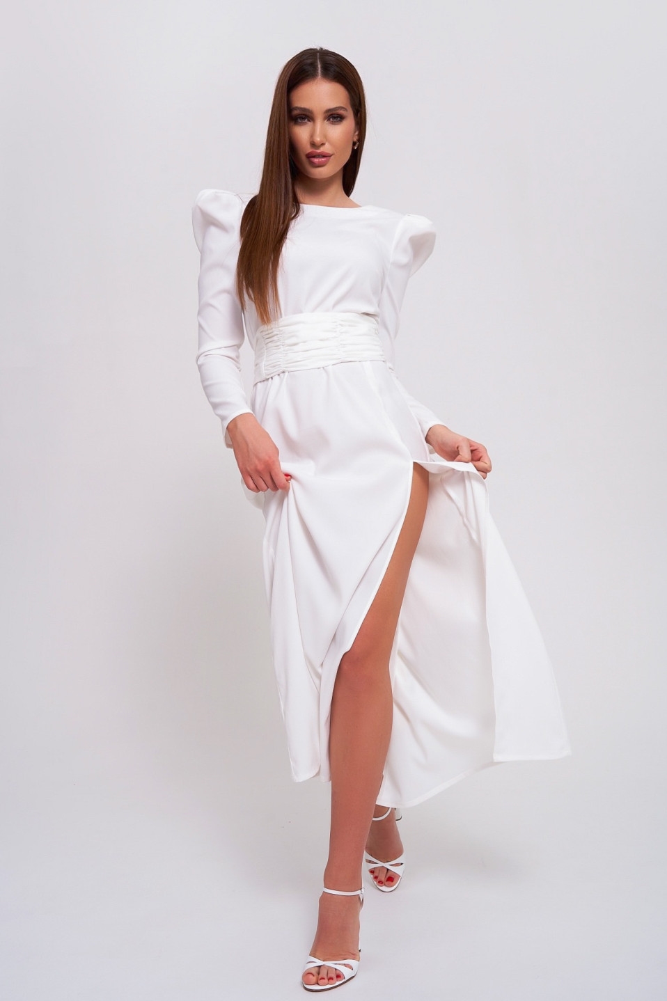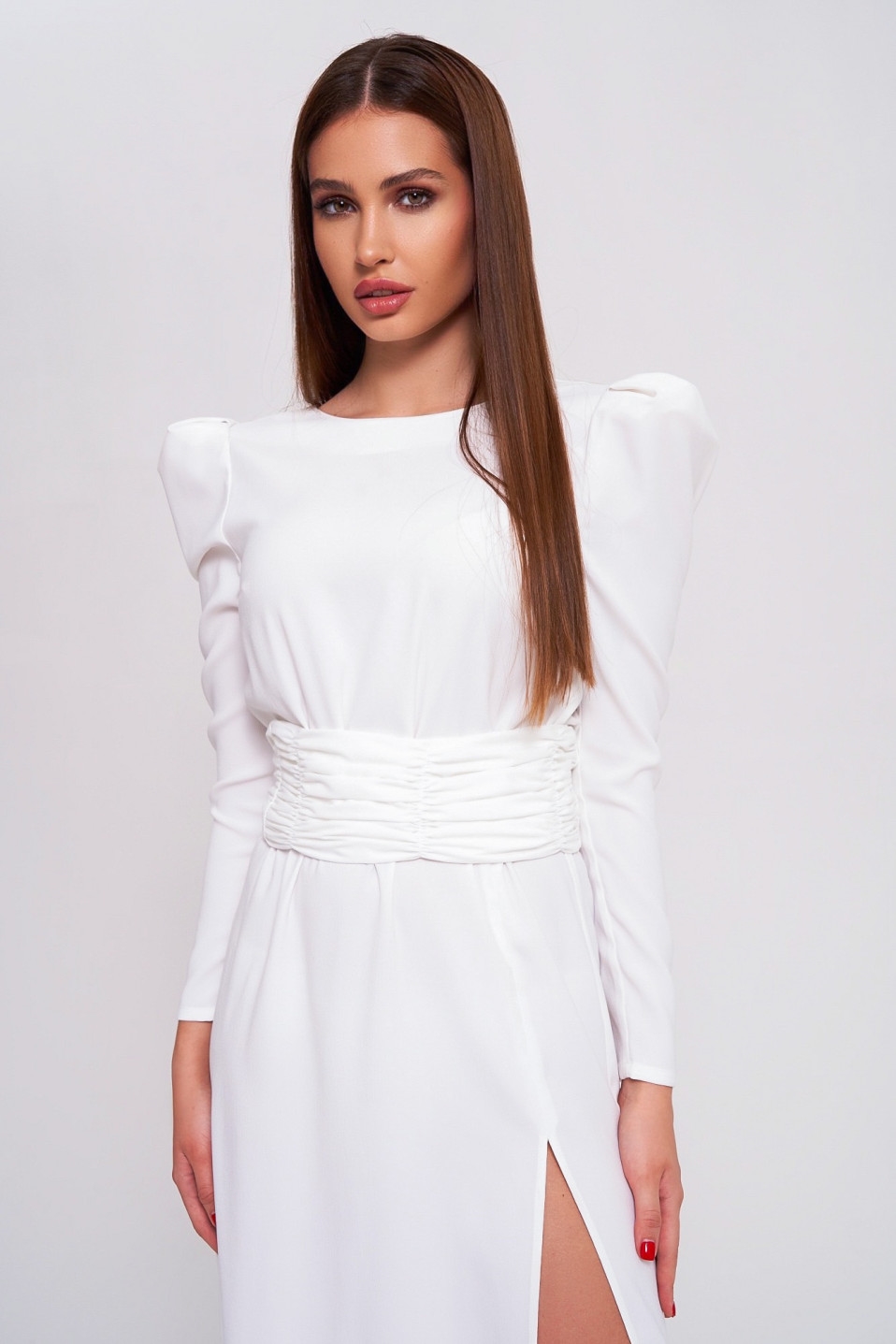 Изысканное платье длины миди полуприлегающего силуэта с изящным пышными рукавами-буфами, элегантным вырезом на спине, рельефными поясом и высоким разрезом.